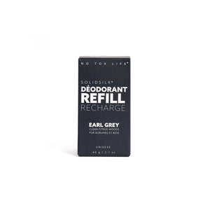 SOLIDSILK Earl Grey Deodorant is all natural and will keep you fresh all day with one light application.  Enjoy a subtle fragrance profile of Earl Grey, clean citrus, and woods. Tapioca starch and bamboo extract absorb wetness while aloe vera juice and golden jojoba wax soften and protect your skin. Refills are available in plastic-free packaging, so you can reuse the outer tube and reduce waste.