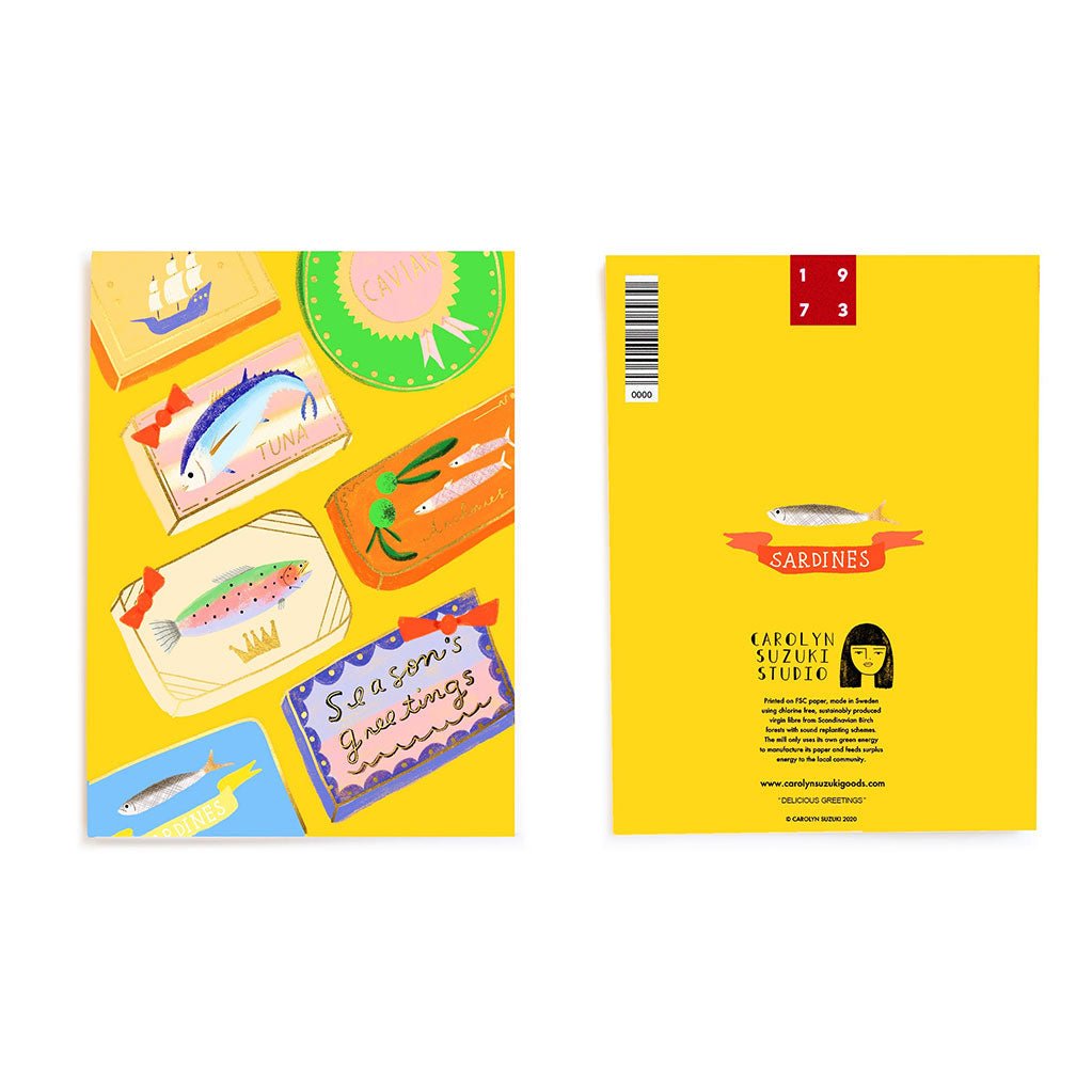 Make this holiday season a little more delicious with a greeting card that's packed with flavor! Colorfully illustrated tins of fish and seafood like anchovies, tuna, salmon, and caviar are brilliantly rendered and outlined in metallic gold foil. The result is a card that is as unique as it is fancy. Because who says you can't send a little catch of the season's best fishes—we mean wishes!