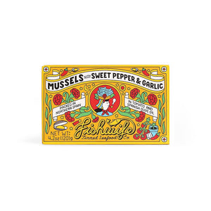 Fishwife’s delicious Mussels in Sweet Pepper + Garlic are soaked in a tomato-based sauce with red pepper, garlic, smoked paprika, cayenne, and spices. They're bold, balanced, and the sidekick to any toasted baguette.