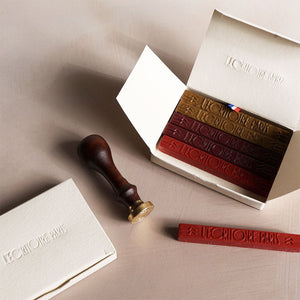 Add an elegant finishing touch to letters, invitations, and packages with a wax seal. L'Ecritoire's premium sealing wax is made in France and comes packaged in a simple but thoughtfully designed paper box. Each wax stick is cast in a mold that bears the L'Ecritoire Paris logo.