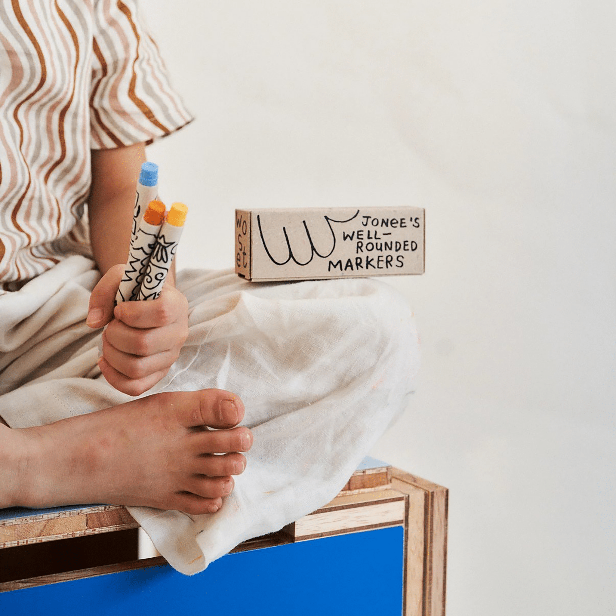 Jonee designed and developed these particular round-tipped markers that can assist in helping even the youngest of makers make. As a Woset scientist, she is constantly researching the world around her, and with these markers, she can do it confidently because they’re built with a smash-resistant tip and a rounded end that allows her to draw at all angles. The set also has an attachment to click together two markers to create unique patterns and playful color combinations.