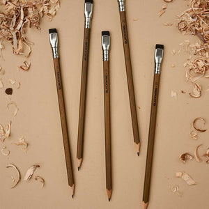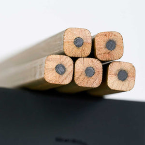 Each pencil features finger-jointed slats, created by joining two short wooden pieces using a classic woodworking technique. Its natural dark brown finish highlights Blackwing's first-ever square barrel with an extra wide face, showcasing the finger joints on every pencil. The firm graphite offers excellent point retention with a buttery smooth feel—ideal for measuring and marking cut lines, and then measuring them again. Each pencil is capped with a silver ferrule, holding Blackwing's iconic rectangular eraser in black.