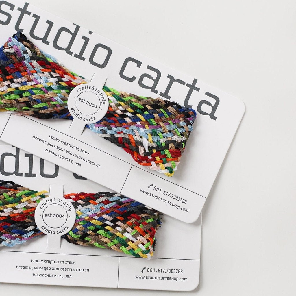 Introducing braided cotton thread from Italy; made to slip in your suitcase for travel or smaller projects on the go. Each braid comes in a multitude of 25 colors. Simply pull gently on the color you’d like to use, and it will slip out with ease from the larger braid of threads. Magic!