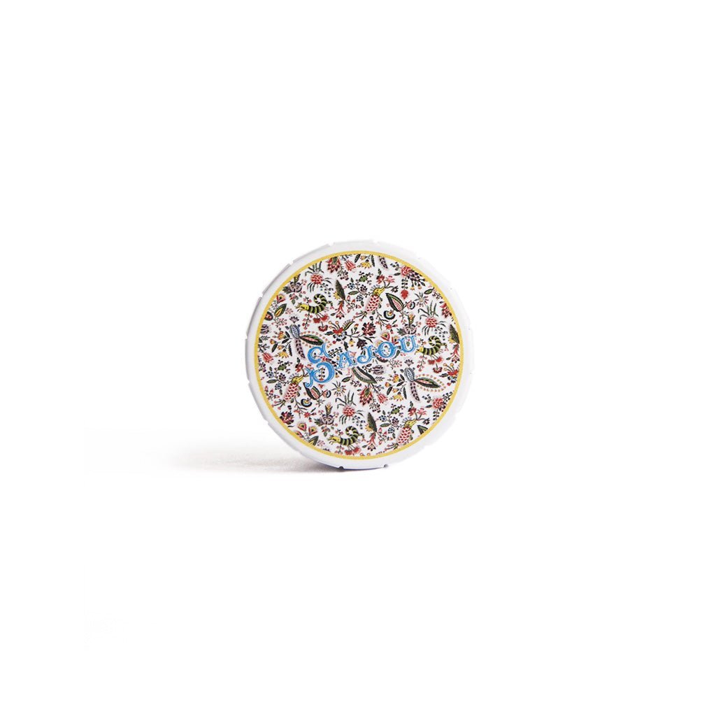 A small metal tin filled with brass fasteners and printed with a traditional Sajou floral motif.