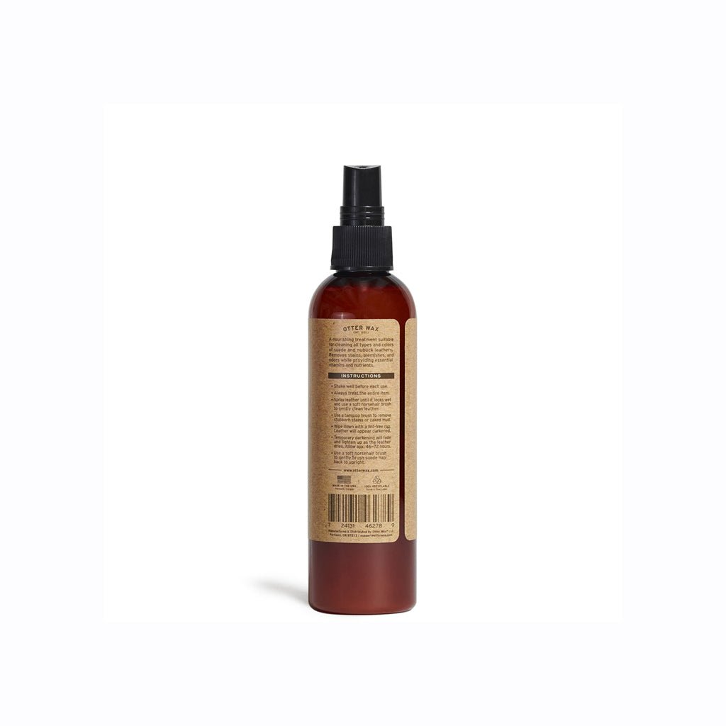 This nourishing alcohol-free treatment and blemish repair is fortified with aloe Vera and Vitamin-C. Ideal for use on all types of suede and nubuck to remove stains, blemishes, and odors while evening tone and coloration. A hydrating formulation of organic aloe leaf, witch hazel, and castile soap gently cleans suede while replacing essential vitamins and nutrients.