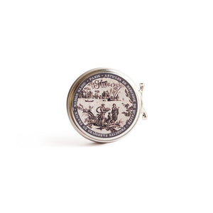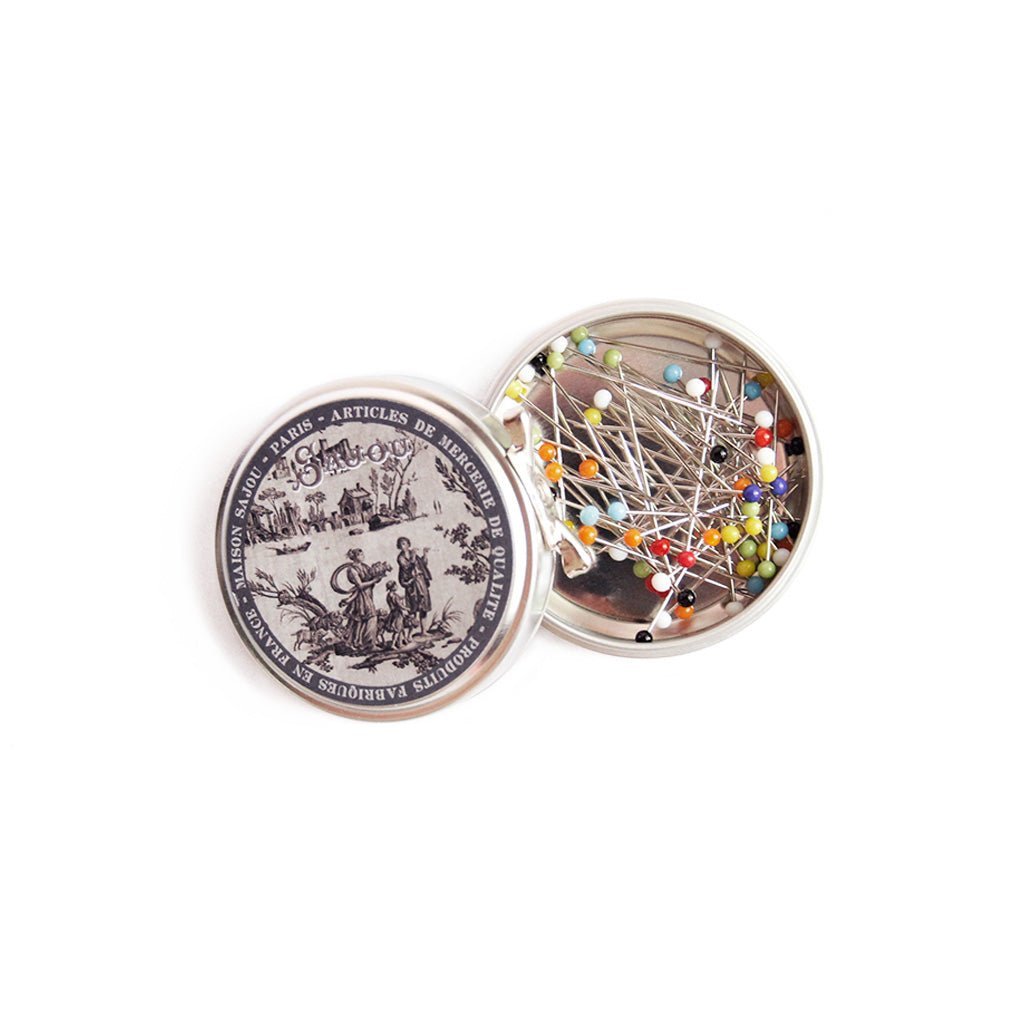 Sixty glass-headed dressmaker's pins in a round tin decorated with a Toile de Jouy motif. A small turn key on the side facilitates opening the tin, just like a can of shoe polish.