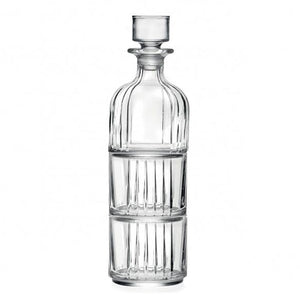 The Beacon Stackable Decanter Set is a four-piece set that includes a crystal decanter with stopper and two matching rocks glasses. Crafted in Italy from premium LUXION® lead-free crystal, the decanter and glasses are heavy for their size, offering a satisfying weight in the hand. Vertical crystal cuts capture and reflect light, enhancing the rich hues of aged spirits like whiskey or brandy.