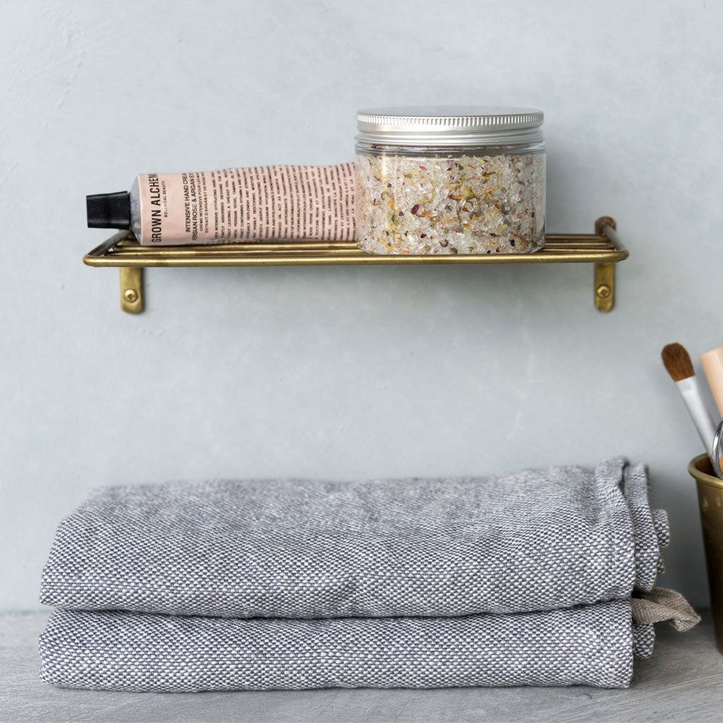 This petite shelf is perfect for mounting in areas like bathrooms or in kitchens, for keeping small essentials elevated and close at hand while freeing up counter space. Handmade from sturdy brass, it will develop a patina over time, adding to its charming character.