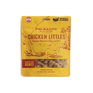 Bone-shaped dog treats made of local, fresh, all-natural chicken breast mixed with long-grain brown rice and potato flour for a perfectly delicate crunch. Chicken Littles are the ideal combination of wholesome goodness and simplicity. Made daily in a kitchen at Boston Fish Pier, Polkadog Bakery treats are handcrafted to be the very best for your pet.