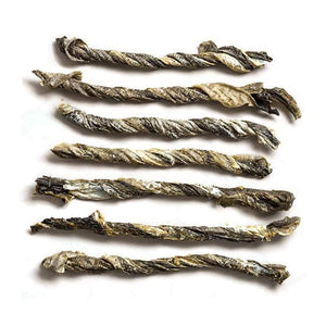 The cod used to make this cod skin jerky for dogs or cats is caught wild in season by fishermen on small boats in Alaska. Each skin is hand-rolled and slowly dehydrated in Polkadog's kitchen on Boston's Fish Pier to create these crunchy, savory, healthy cod skin treats.