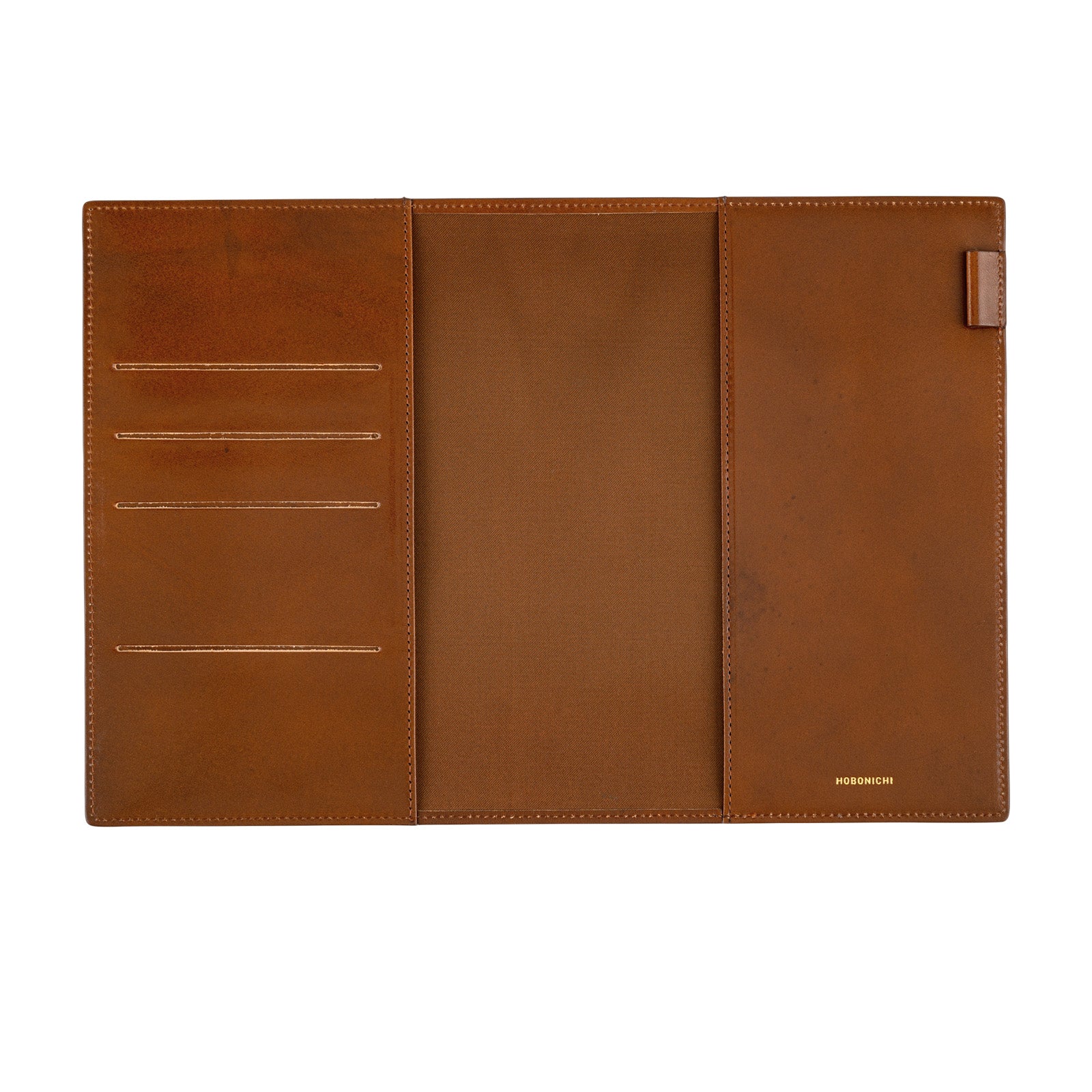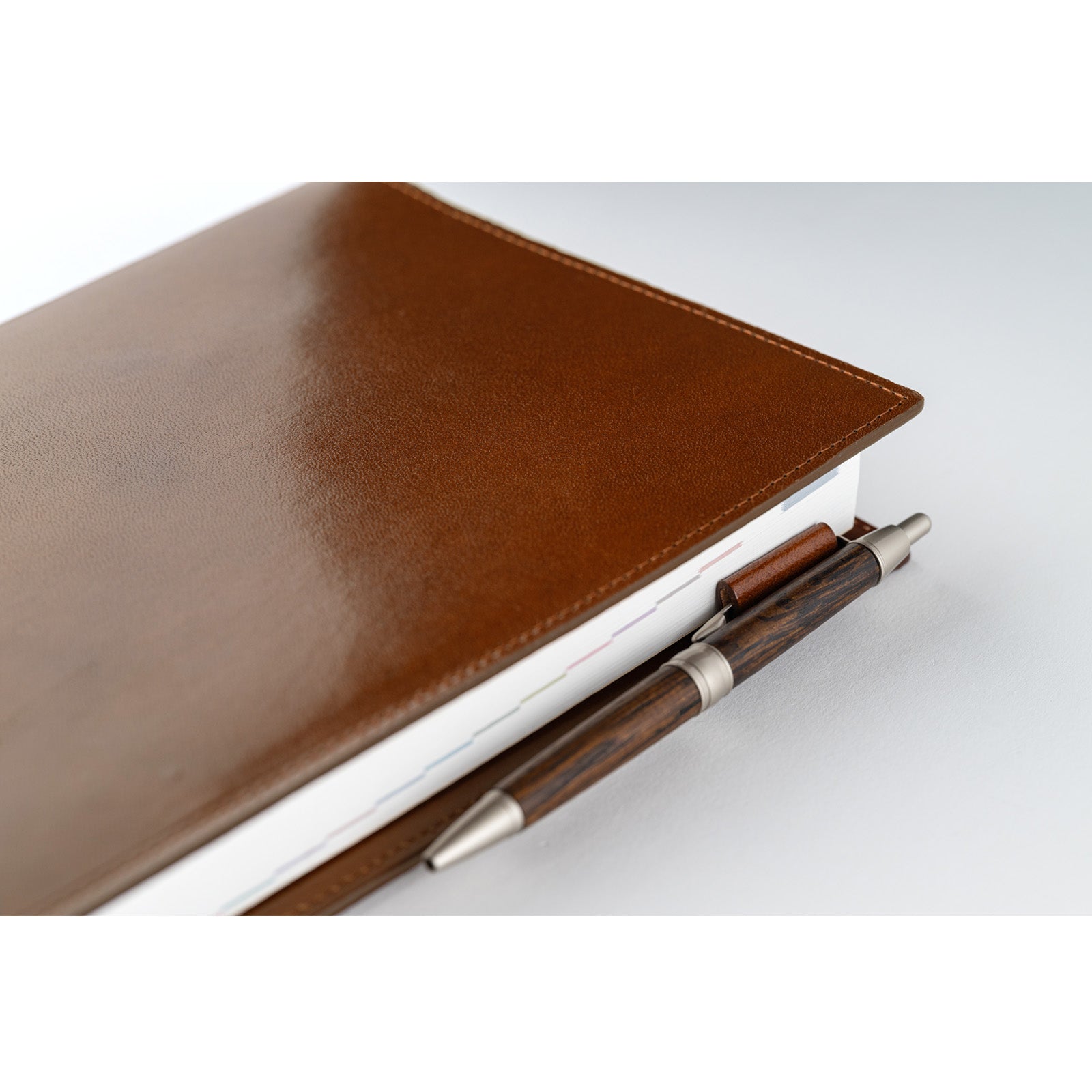 A slim leather cover designed to offer a snug fit for the Hobonichi Techo Cousin A5. Crafted of brown Italian leather with a beautiful luster, this slim cover has several slot pockets on the interior as well as a pen hook.