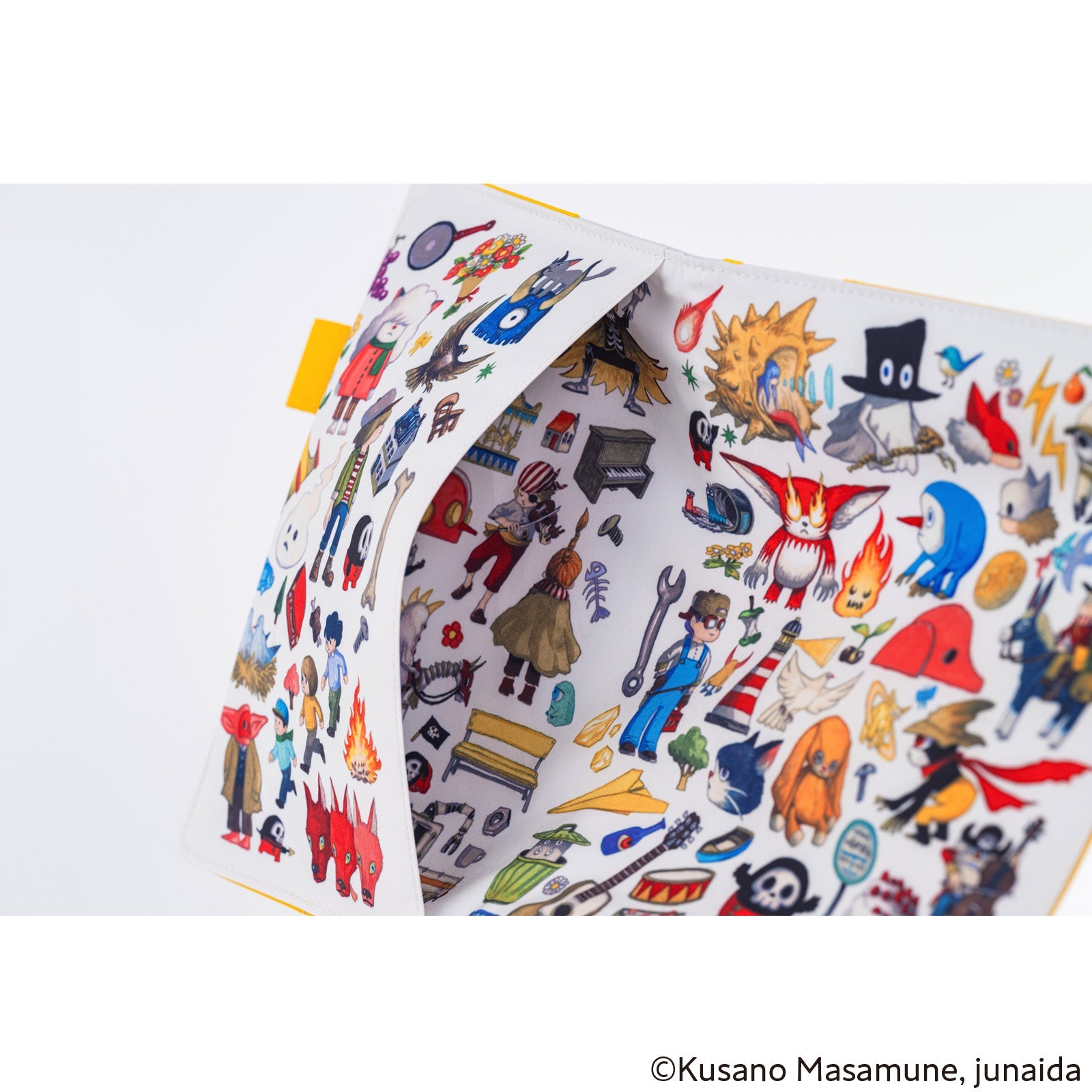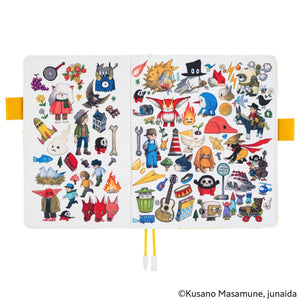 A fabric cover designed to fit the Hobonichi Techo Cousin A5. The design features illustrations taken from the front cover of the song-art book Himitsu Stranger, which is based on the lyrics from 13 songs recorded by Masamune Kusano for the Spitz album "Himitsu Studio". Artist junaida illustrated the lyrical stories for each of the songs. The butterfly pen holders function as a clasp to keep the cover securely closed with a pen, and smart ribbon bookmarks help you keep track of important pages in your planner.