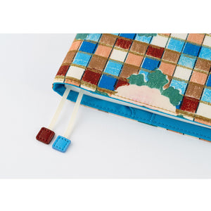 A fabric cover designed to fit the Hobonichi Techo Cousin A5This innovative design features large flowers on a background that looks like tile or colored glass. The design was inspired by Bijutsukai, a collection of craft designs that was published in the Meiji era in Japan (late 1800s to early 1900s). The bookmark charms are shaped like tiles, as if they'd been pulled from the design. Butterfly pen holders function as a clasp to keep the cover securely closed with a pen, and ribbon bookmarks help you keep track of important pages in your planner.