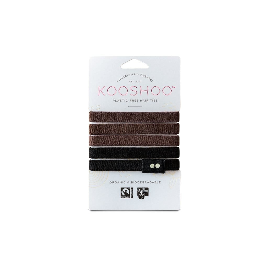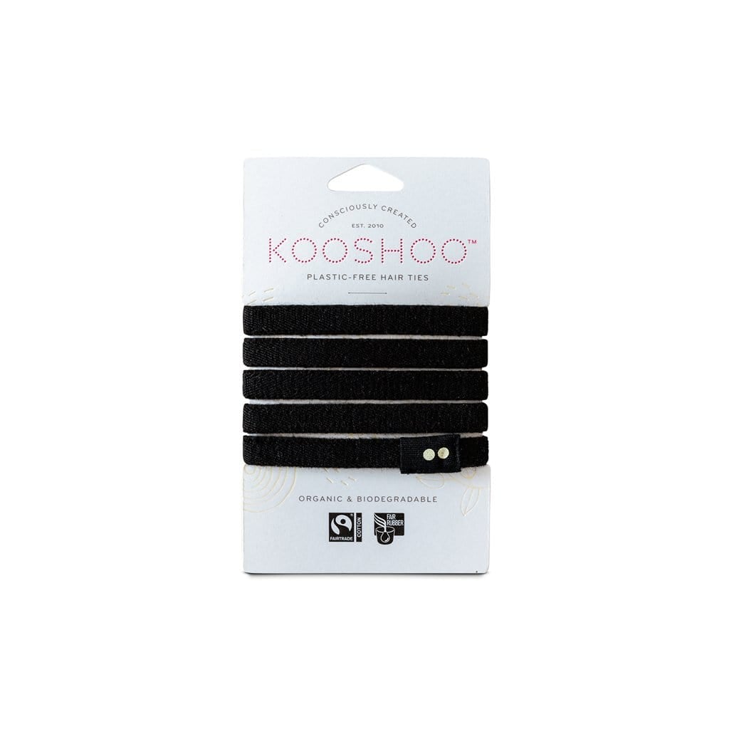 A pack of organic cotton, plastic-free, biodegradable hair ties. Kooshoo's hair ties are made in a Fair Trade-certified facility using certified organic cotton and natural rubber. Great for thick hair, kids, athletes, and everyday wear. Now when your hair ties go missing like socks in the laundry, you can rest assured they will eventually biodegrade and go back from whence they came.