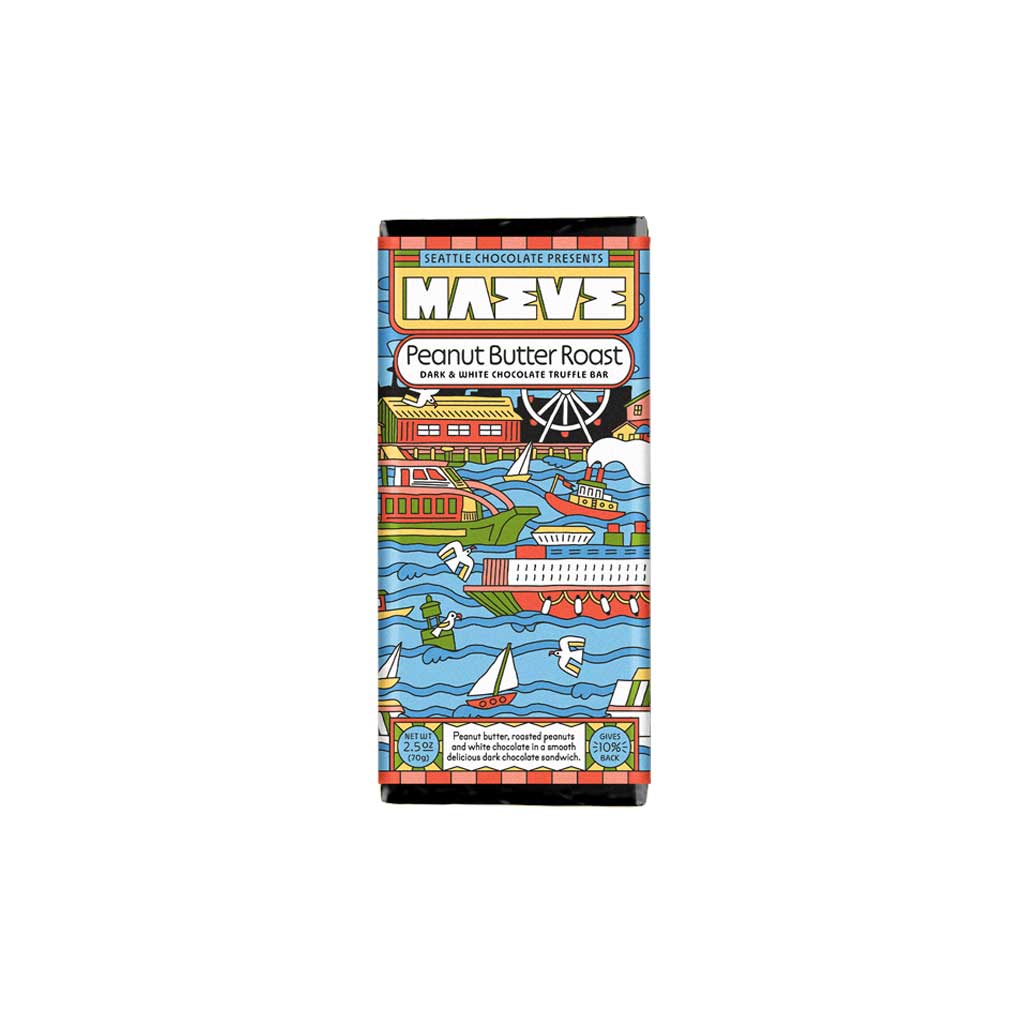A delicious sandwich of peanut butter, roasted peanuts, and white chocolate forms three layers of melt-away magic in Maeve's Peanut Butter Roast Truffle Chocolate Bar.