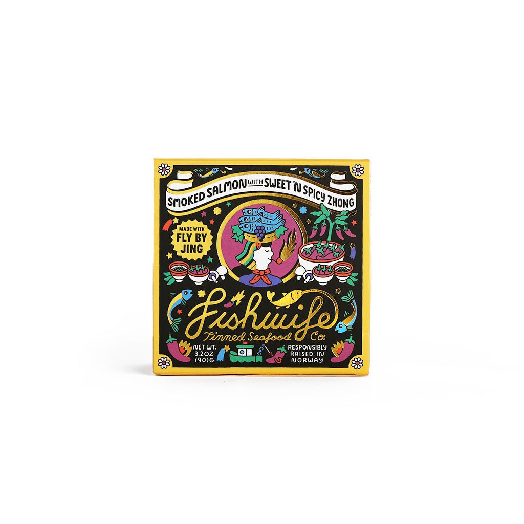 Sweet & Spicy Zhong is a complex, sweet and savory chili sauce. This tin is a flavor-packed smash of Fishwife's caramelized, tender, and campfire-y smoked salmon and Fly By Jing's sweet, tangy, spicy and umami-rich Zhong sauce.
