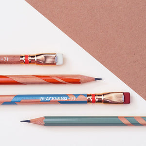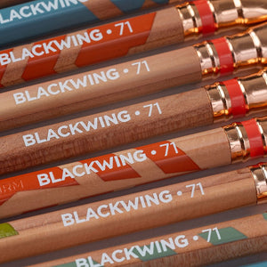 The Blackwing 71 is a tribute to Frank Lloyd Wright and his architectural ambition. Each pencil features a silhouette of one of Wright’s iconic perforated boards printed in a muted, midcentury palette. The area around the board is unfilled, letting the natural wood of the pencil shine through. Each pencil also includes a copper ferrule and Blackwing's extra-firm graphite.
