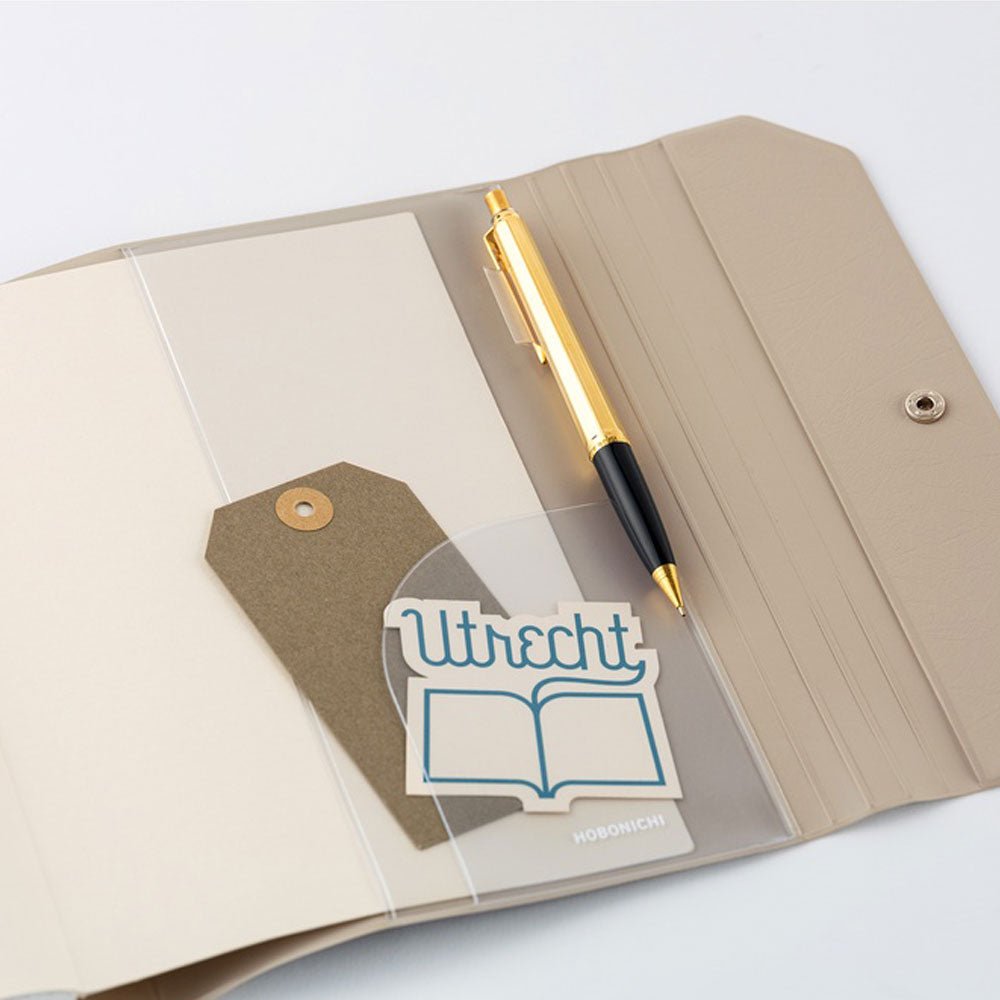 Alettone: Gray combines a soft, warm tone with subtle taupe undertones—quiet and timeless. On the cover, it bears the message: “Writing by hand is like sending your mind on a journey.” Made from lightweight PVC, this tri-fold cover closes securely with snap buttons and includes an interior hook to hold a pen by its clip.