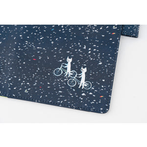 A fabric cover designed to fit the Hobonichi Techo Cousin A5Designed by Hiroko Kubota, this cover shows two cats walking their bikes on a spring evening. On the back of the cover is a mouse playing a harp. The field behind them is filled with blooming cherry trees, creating an enigmatic scene that combines the stillness of the night with the murmur of the wind. Butterfly pen holders function as a clasp to keep the cover securely closed with a pen, and ribbon bookmarks help you keep track of important pages in your planner.