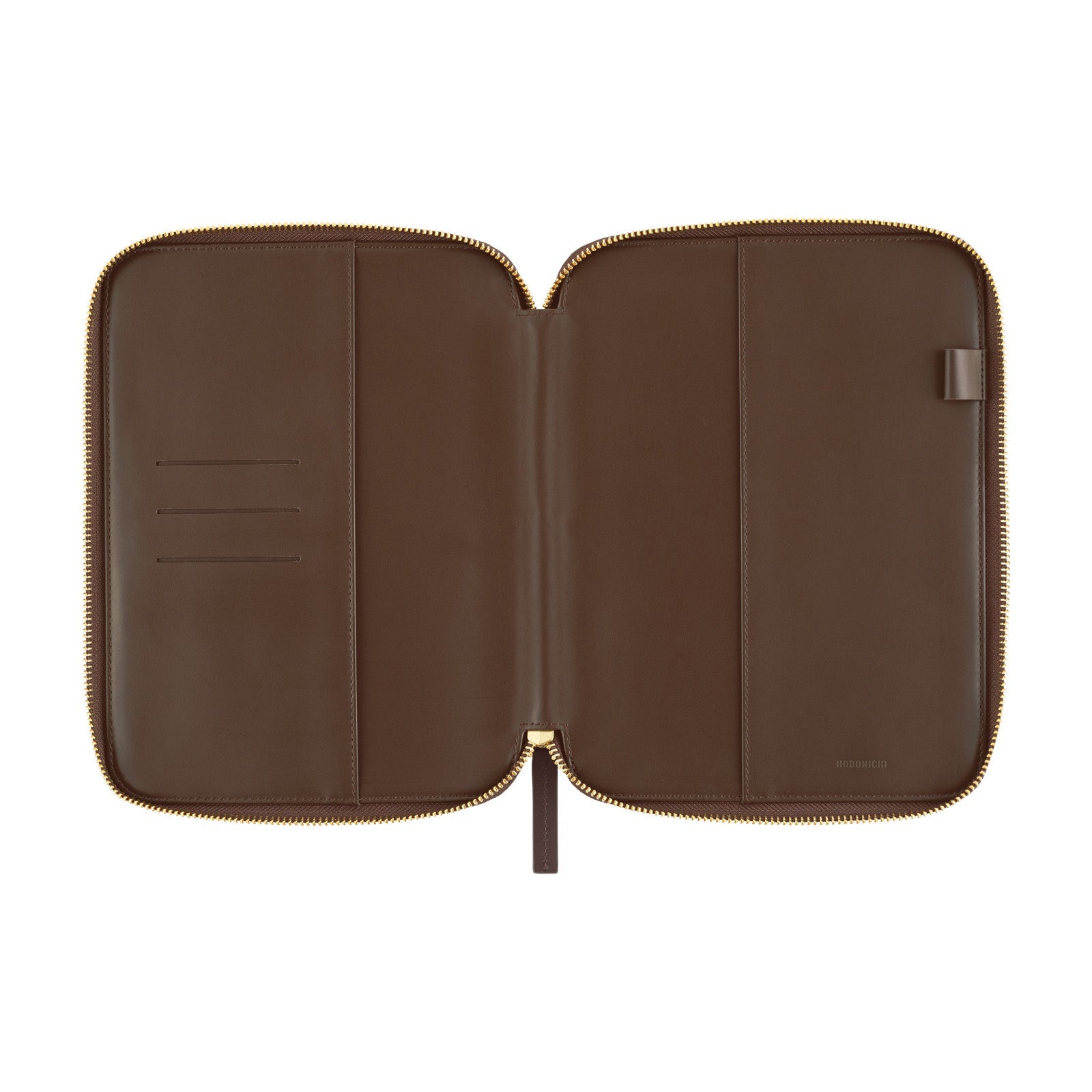 A zippered wool and leather cover designed to fit the Hobonichi Techo Cousin A5. This slim zippered cover fits snugly onto the Techo book. It's made with fabric from renowned Italian textile house Bonotto. The cover zips up to keep papers and accessories neatly inside its pockets.
