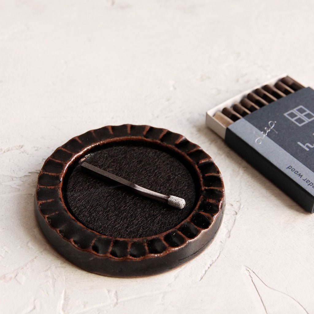 This incense tray was designed by the makers of Hibi Incense Matches and is designed to fit the Hibi burning pad (included with every box of Hibi matches) perfectly in the center.