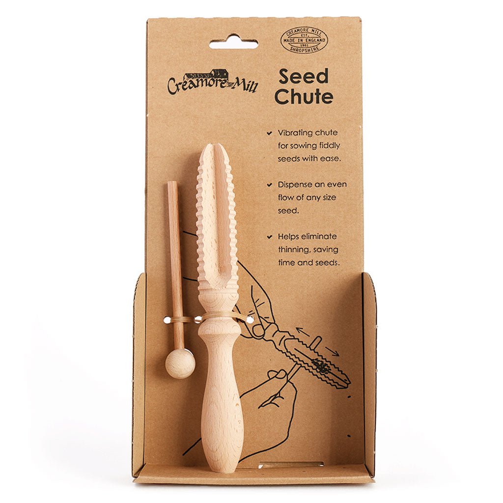 A vibrating chute for sowing fussy seeds with ease, packaged with instructions on the back. This irresistibly fun and functional instrument makes a perfect gift for amateur and professional gardeners. Rubbing the stick and ball on the ribbed chute controls the flow of small and medium size seeds to save wasting seeds and reduce the need to thin seedlings later on. Full instructions on packaging.