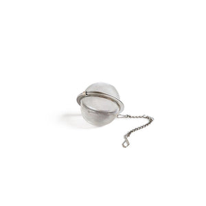 This stainless-steel metal mesh tea ball is 2 inches in diameter and has a locking clasp and chain. It's ideal for steeping loose tea in a cup or small teapot. The chain has a hook at the end for securing the ball on the edge of your cup.