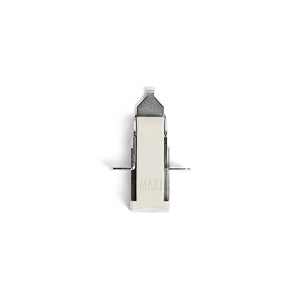 Use: Slide the bottom two-pronged plate under the staple you wish to remove. With your thumb on the back of the staple remover and two fingers on the metal "wings", gently pull the cartridge back, so that the hook catches on the staple and pulls it away from the paper. Discard the removed staple in the trash.