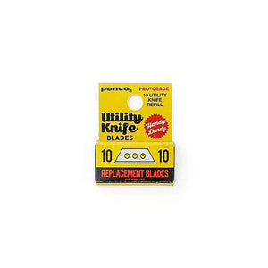 A pocket-sized metal utility knife by Penco. At just over 3" long, it tucks nicely into a pocket or bag. Comes with a heavy duty steel blade and a beaded chain which keeps it handy and at-the-ready for opening boxes or snipping strings and cords. The button on top locks the blade in two positions, for two blade lengths. The knife is endlessly refillable with replacement blades.